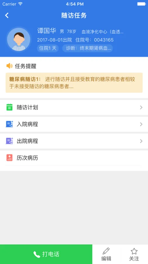 移动随访,是一款专业的基于医患沟通,电话随访的移动APP应用。支持医师使用手机电话随访、电子病历手机查阅、医患在线沟通。采用联通沃云通话方案,使用虚拟座机号码随访患者,并自动保存通话语音,是一款灵活便利的智能随访工具。