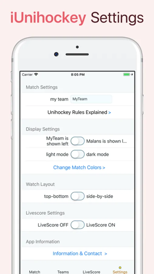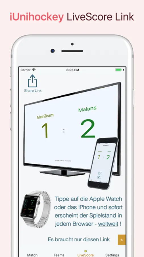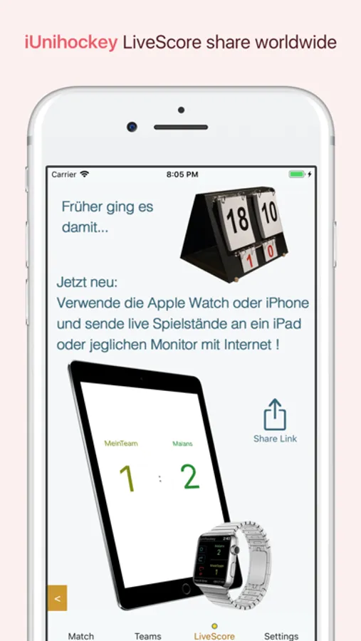 iUnihockey's newest feature is the "LiveScore" (It works on iPhone or Apple Watch): Tap on the iPhone or Apple Watch and see your Scores immediately on any browser - worldwide!