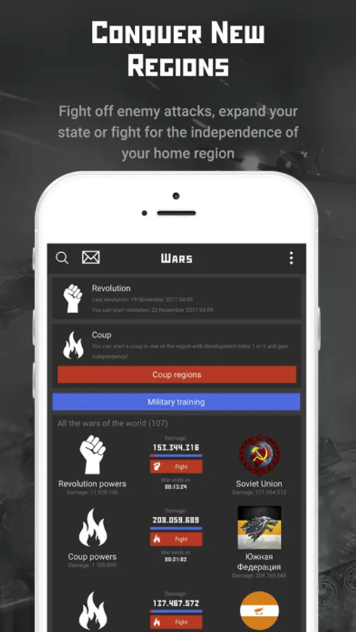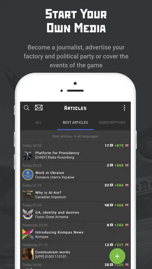 You will take part in air, land, sea and space wars, create your own newspapers and publish articles, use real world regions to form your own state and choose its form of government: dictatorship or presidential republic? It's your choice!