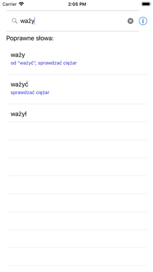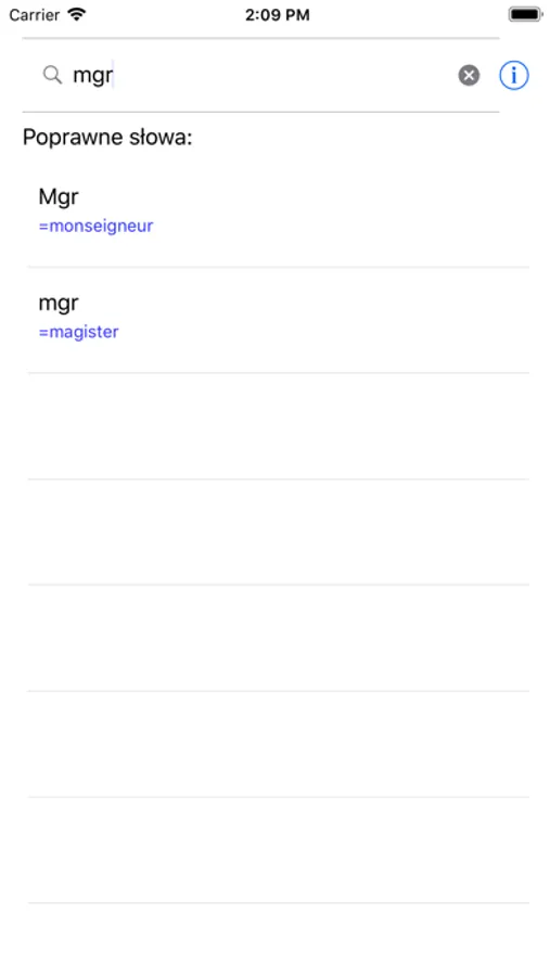 Słownik ortograficzny języka polskiego. Pozwala na sprawdzenie pisowni ponad 2 mln 300 tys. słów z odmianami. Po wpisaniu słowa w polu wyszukiwania aplikacja sprawdza zapis i dokonuje ewentualnej korekty gramatycznej. Na liście wyświetlane są poprawne wyrazy. Słownik nie wymaga do działania połączenia internetowego.