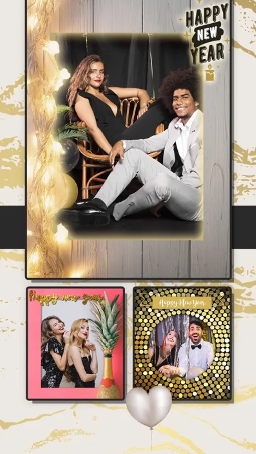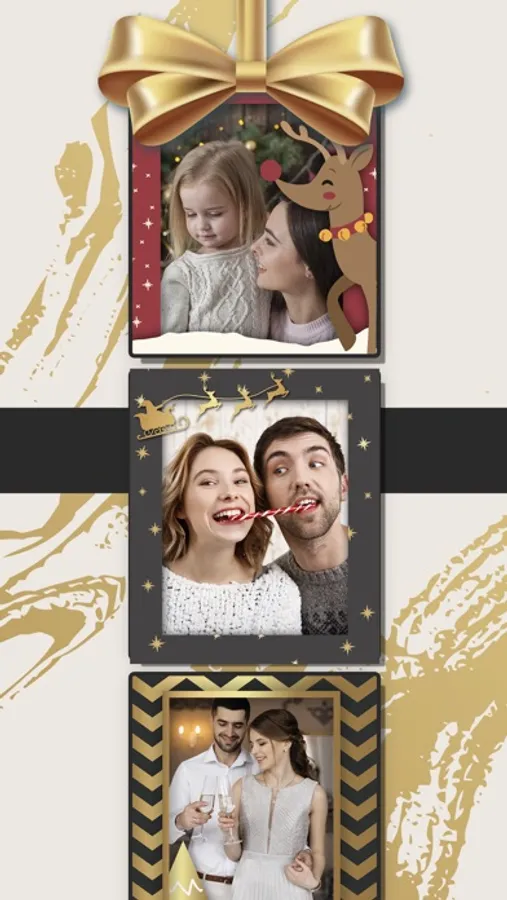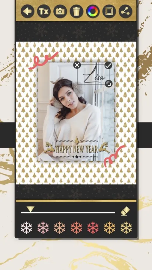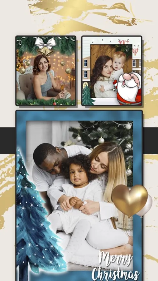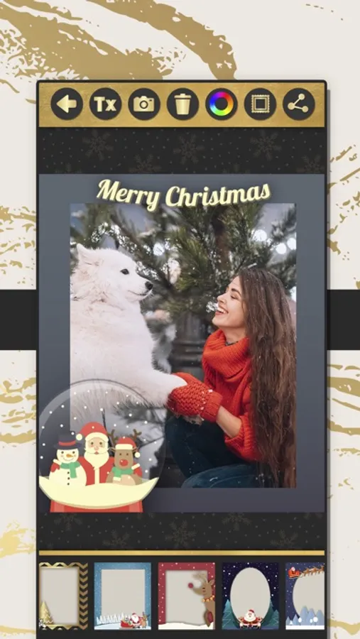 1. Choose the photo frame and make a photo or select a picture from the gallery. You can add texts with different fonts, colors (from blue to violet) and sizes or add a sticker with a Christmas photo then save or share with whomever you want.