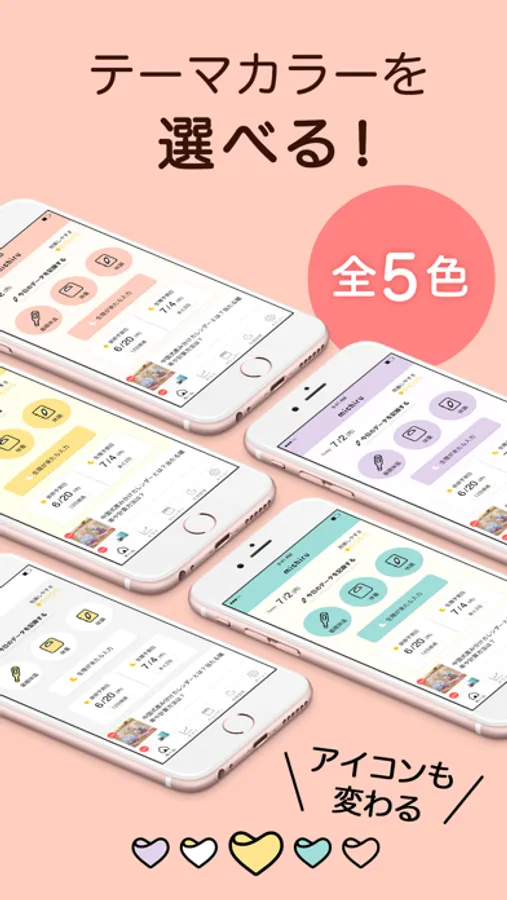 ピンク、イエロー、ミントグリーン、ラベンダー、ホワイトの5色から選べます。テーマカラーを変更すると、アプリアイコンの色も変化します。