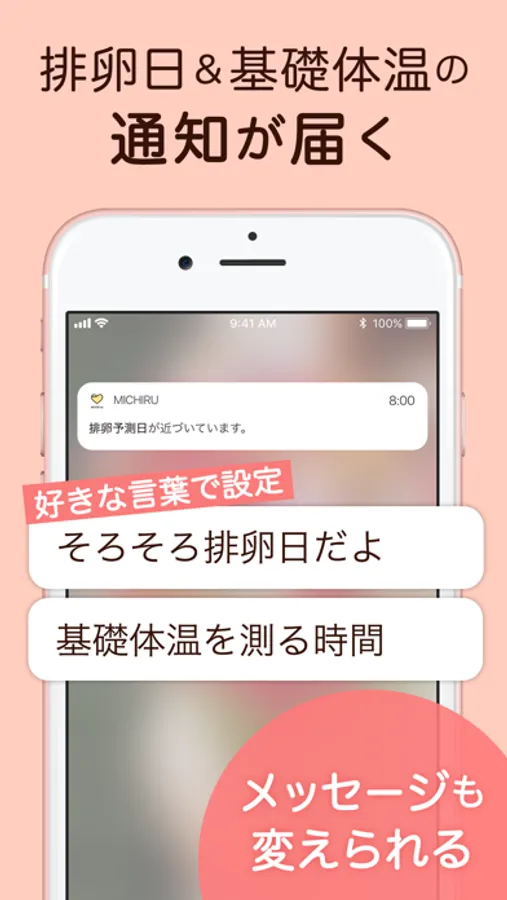 排卵予測日・生理予測日をプッシュ通知でお知らせする設定が可能です。通知日(何日前か)・通知時間・通知メッセージをお好みでカスタマイズできます。