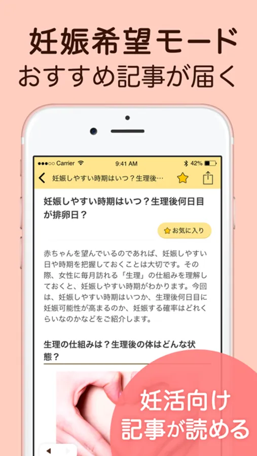妊活中の方は妊娠希望モードが選べます。妊娠希望モードにすることで、妊活に役立つ基礎体温のアラーム設定と、妊活に役立つ記事を読むことが出来るようになります。