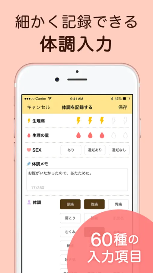 その日の体調(頭痛・むくみ・腰痛・不正出血・排卵痛など)、や気分、お通じ、おりもの、生理痛に関してや、薬の服用、通院の記録、セックス(避妊のあり/なし)といった、生理管理や体調管理にまつわる様々な項目を、日ごとに管理することができます。