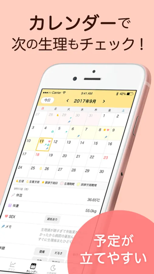 入力された日々のデータから、自動で生理予測日や排卵予測日、体重や基礎体温、その日の気分などが一覧でわかるカレンダーが作られるので、予定が管理しやすくなります。