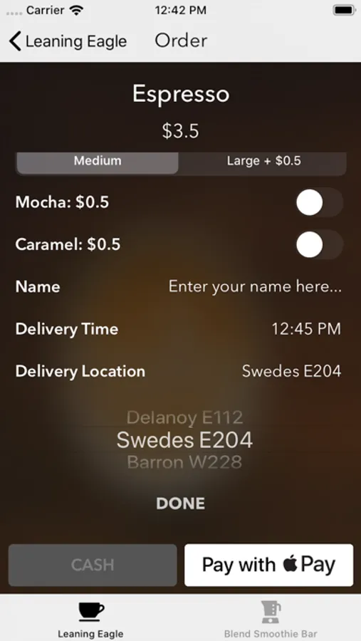Leaning Eagle allows students of Cincinnati Hills Christian Academy's High School to order coffees, sodas, smoothies, and drinks ahead of time quickly and effortlessly directly to class. A simple user interface allows you to purchase the item in five taps or less.