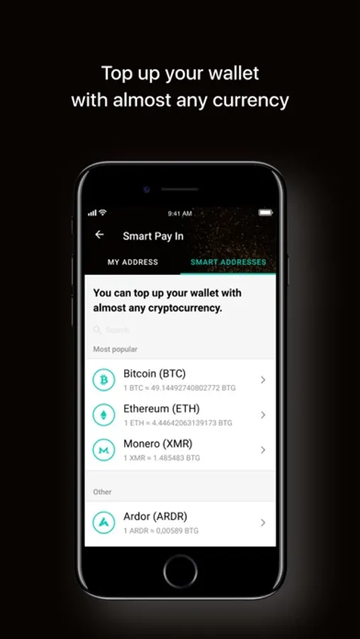 Top up your balance with almost any crypto and send coins to almost any altcoin address. All transactions between Freewallet’s users are completely free of charge. You can see your balance in fiat currencies and monitor real-time price charts. If you are keen on BTG trading, the app comes with a built-in exchange, so you can convert Bitcoin Gold to almost any other currency directly in the wallet.