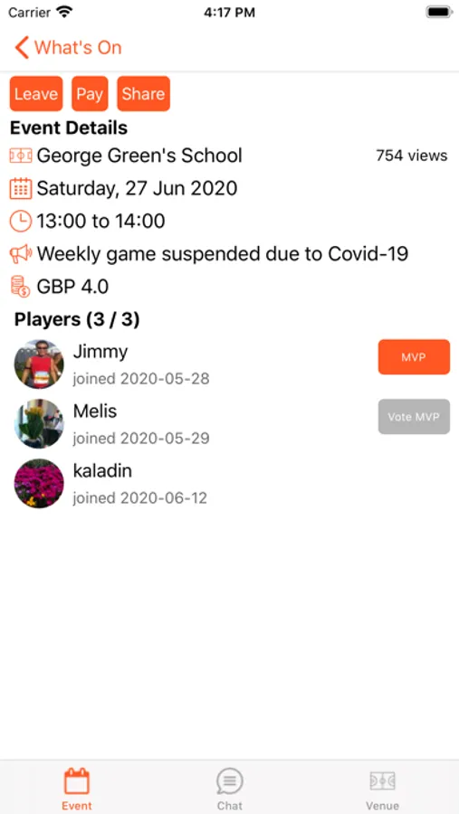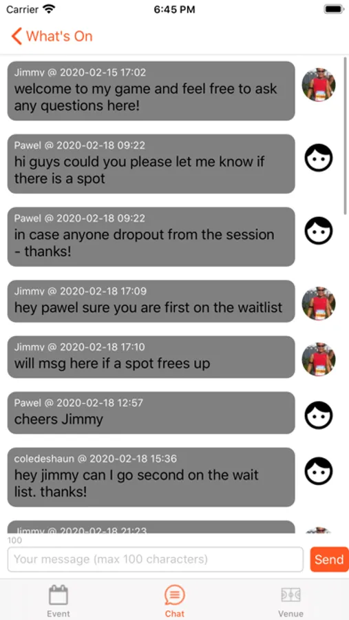 -- create an event by picking a location on a map, filling in a date, time and a short message, and the app works in the background to find the right sports buddies for you