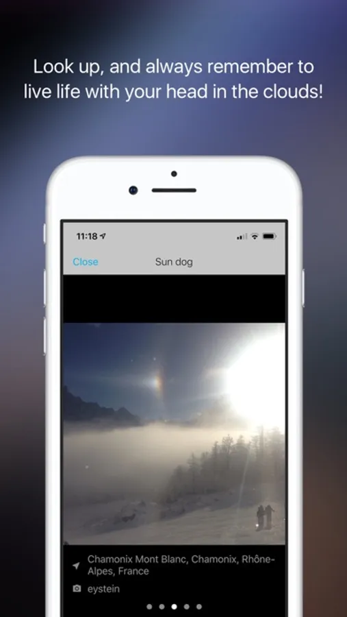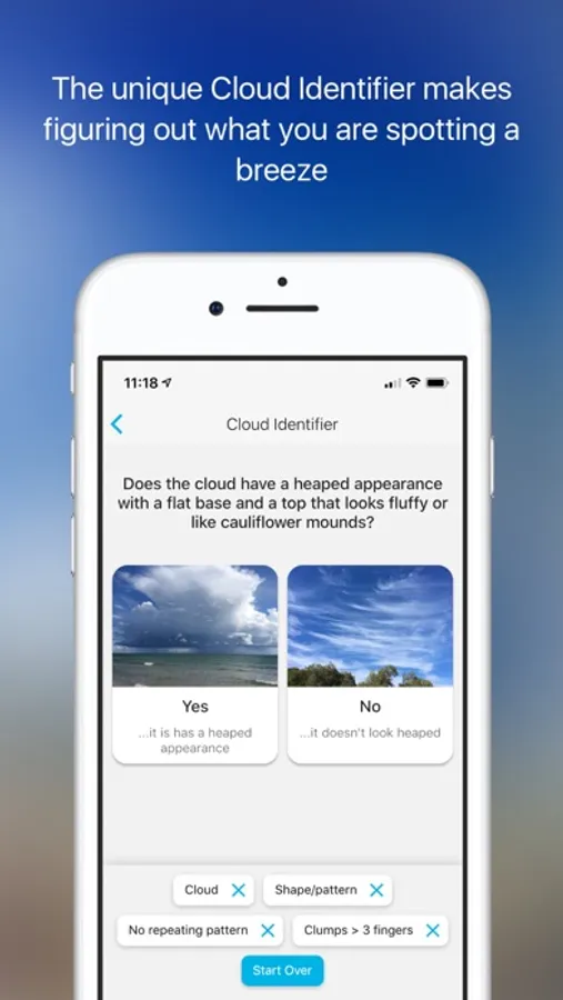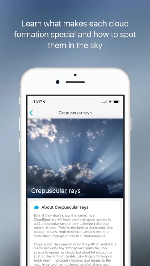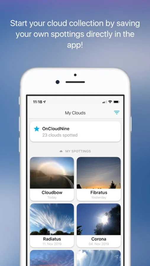 Start building up your cloud collection by snapping photos of your own spottings to save them in the app. In a future app update, you will be able to earn stars and achievement and see pictures from other cloudspotters around the globe!