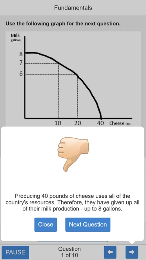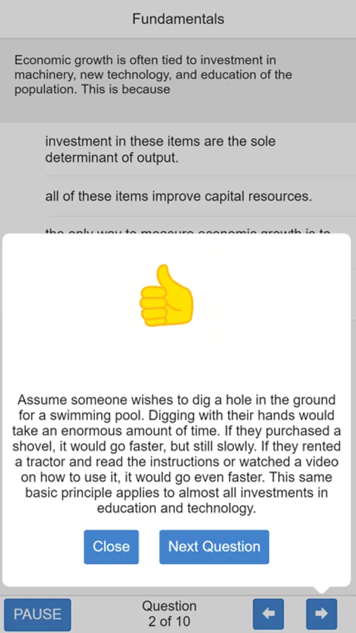 The operation is simple. Choose from one of the 5 domains (fundamentals, micro, macro, international trade, or personal finance) and you will get assigned 10 random questions. Instant feedback is provided after each question whether it is answered correctly or incorrectly. After the 10 questions are over, you get a score and can immediately try the same domain again, or choose a different domain. Quick, simple, effective.