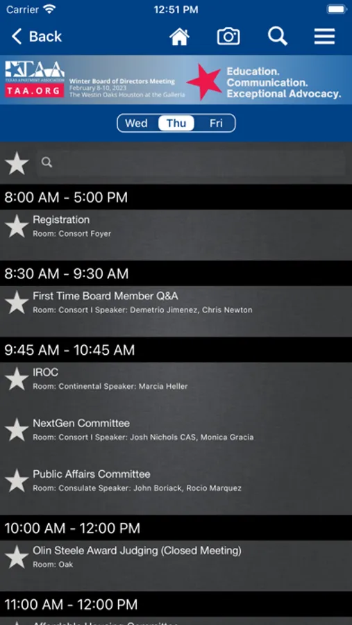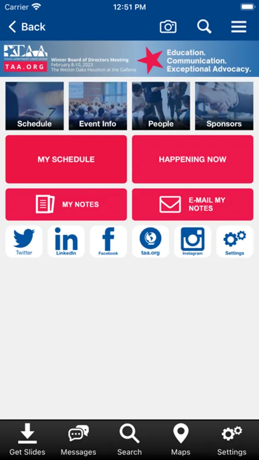 The Texas Apartment Association mobile application allows you to access the Association's annual conferences. Within the underlying event apps, users can access presentations, exhibitors, and connect with other attendees. Users can also take notes adjacent available presentation slides and draw directly on slides inside the event apps.