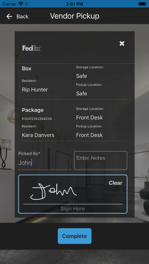 Resident can acknowledge the package receipt by digitally signing through app itself, and gets acknowledgement email notification immediately.