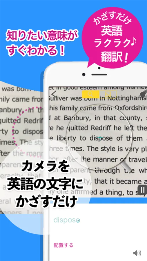 *ルーペの中の英単語を自動で探し出し、リアルタイムに日本語の意味を表示します。日本語=>英語の辞書の利用もできます。(アプリ内課金機能。)