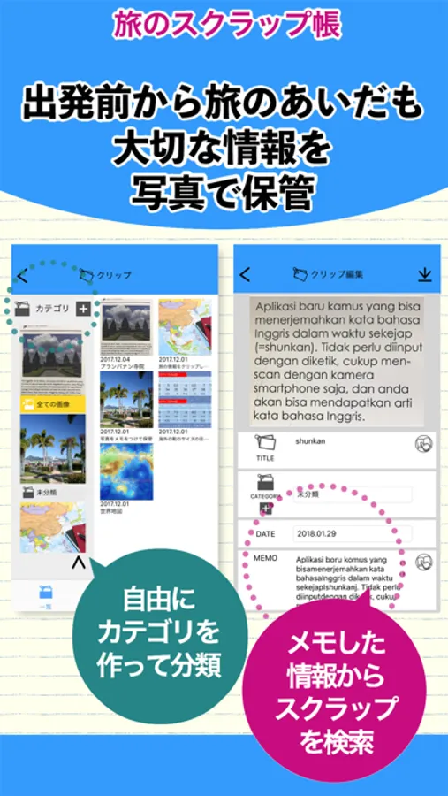 撮影した写真から保存したい部分をクリッピングして、日付、カテゴリ分けやタイトル付け、メモ記載が