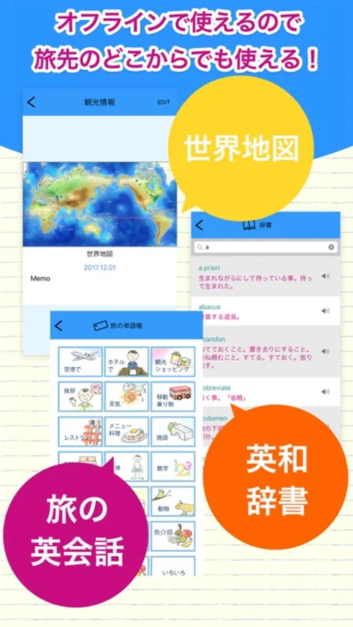 英語の翻訳と辞書(日本語=>英語)、旅の写真管理機能があります。