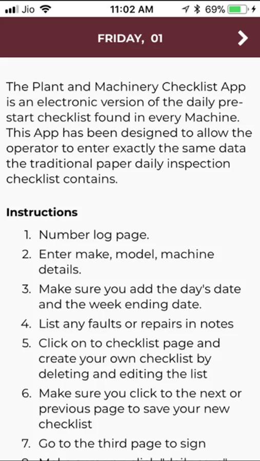 The Plant and Machinery Checklist App is an electronic version of the daily pre-start checklist found in every Machine. This App has been designed to allow the operator to enter exactly the same data the traditional paper daily inspection checklist contains.