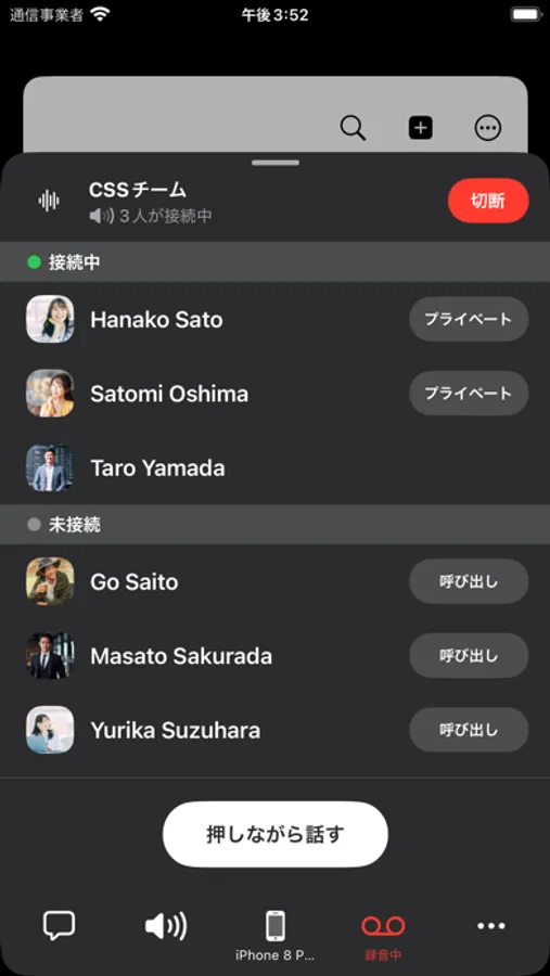 スマートフォンのインターネット回線を使ったグループ通話ツールです。最大の特徴は、常時接続で「話した時だけ接続する」事です。テレワーク(リモートワーク)でご活用いただくと、チームで常につながりながら働くことができるため、実際に同じ空間にいるかのように業務上の会話を進めることができます。
