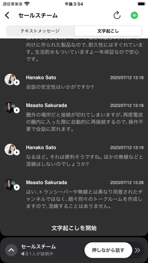 会話内容を録音・テキスト化して保存、一斉通知することが可能です。日報を声で入力したり、そのまま議事録として使用するなど、業務の効率化を加速させます。