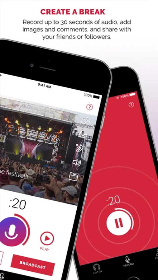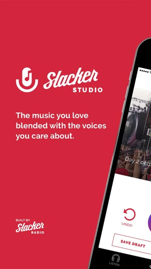 Broadcast your own voice to your followers, and they'll hear your unique personality right alongside their favorite songs. Record up to 30 seconds of audio in Slacker Studio (we call that a "Break"), add custom images and comments, and then publish straight to your friends' streams. Want to share some music? Record an intro, attach it to a song, and broadcast it to fellow Slacker Studio users.