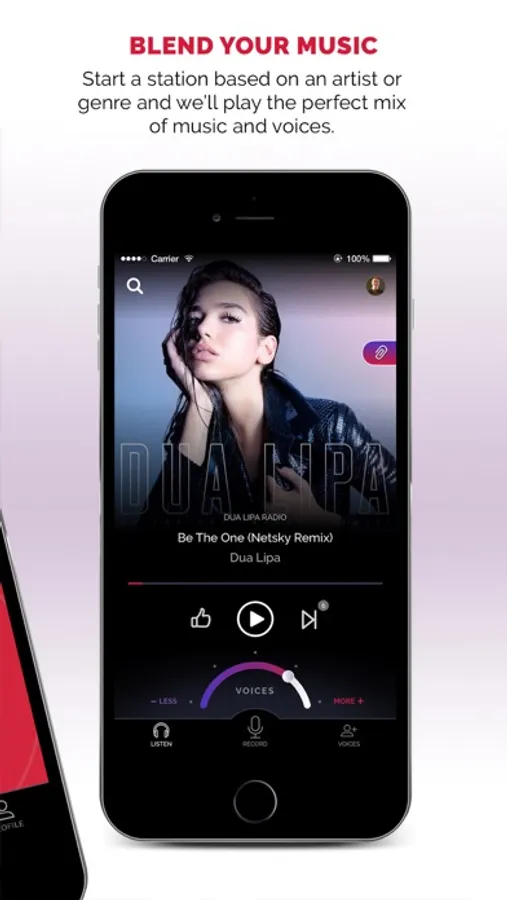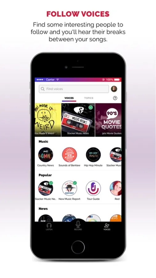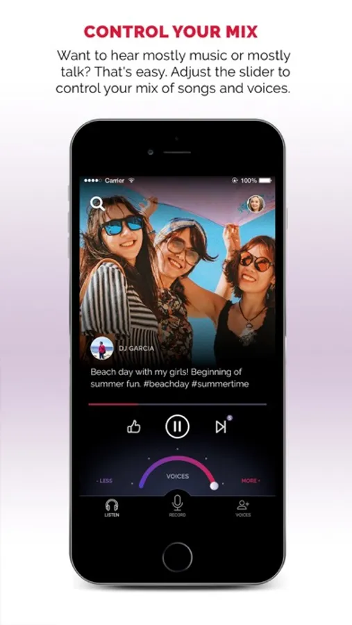 Pick your favorite station and start listening. Find some interesting people to follow and you'll hear their voices between your songs. Want to listen to Today's Hits, but hear the voices of your best friends pop in after a few songs? You can do that. Want to listen to classical music but hear ABC News headlines and podcast comedy clips pop in after a few songs? You can do that. Want to hear mostly music or mostly talk? Yeah, you can do that too. YOU control the mix of songs and voices.