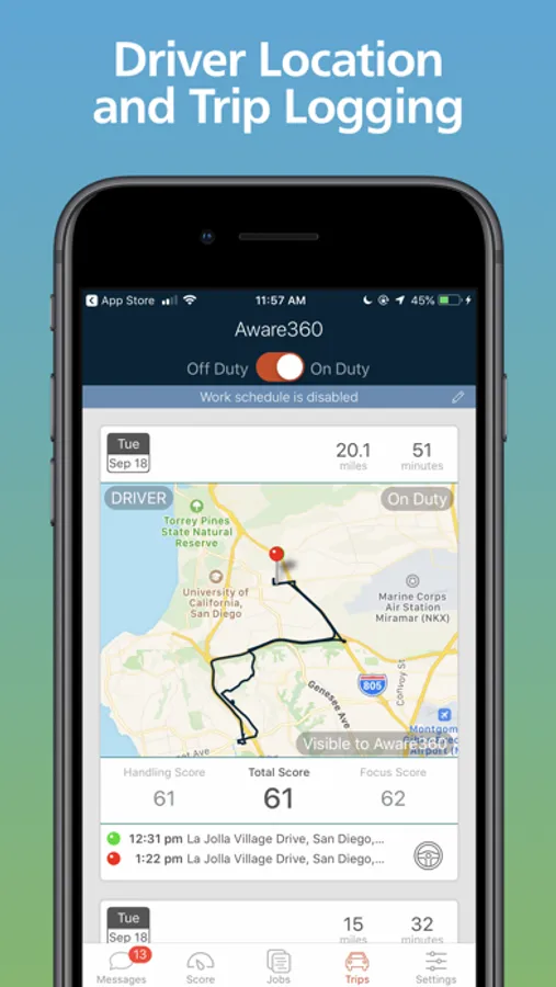 Where are my drivers? iDriveAware keeps track of your driver's location while on-duty and displays each drive and stop on the activity overview screen on the web portal.