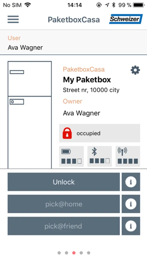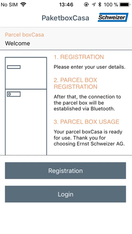 The parcel boxCasa receives parcels when no one is at home and is manufactured by Ernst Schweizer AG. You must register in order to be able to use the app. You must also have a parcel boxCasa installed at home or have received authorisation to use a friend's.