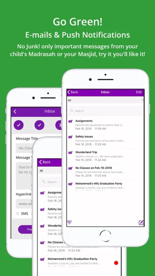 -Admin of an organization can send messages via email & Push Notification to Followers & Madrasah users