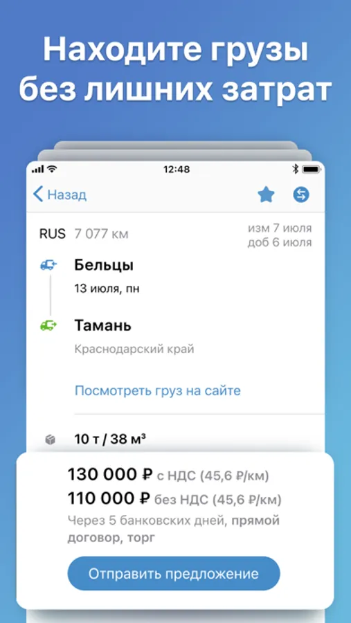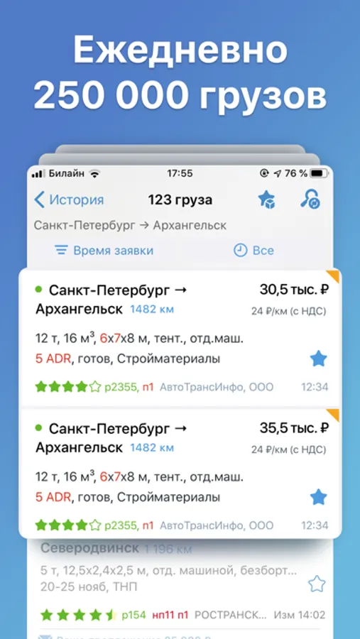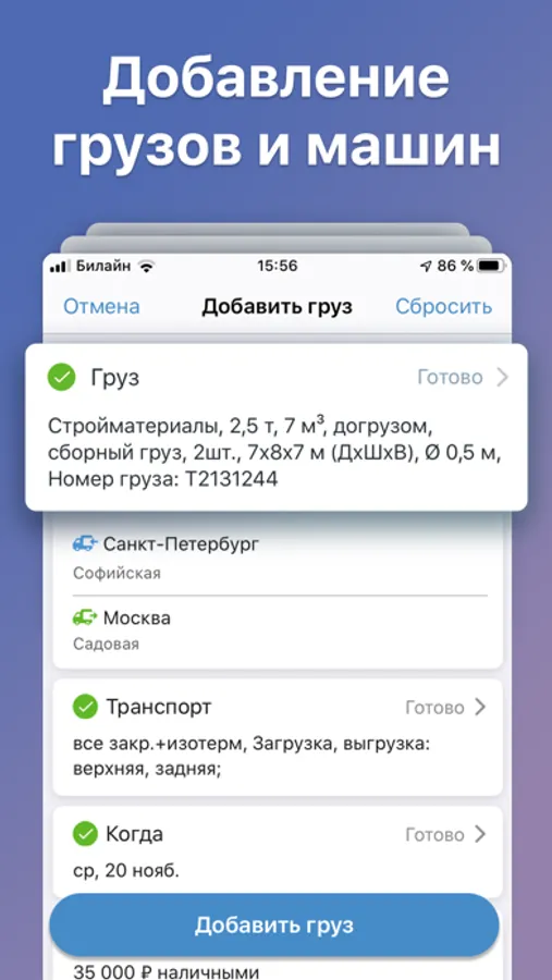• Добавляйте свой транспорт и получайте грузы от грузовладельцев.