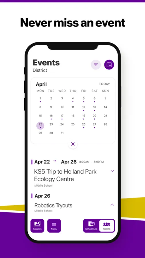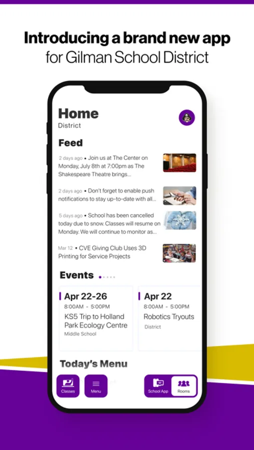 The event section shows a list of events throughout the district. Users can add an event to their calendar to share the event with friends and family with one tap.