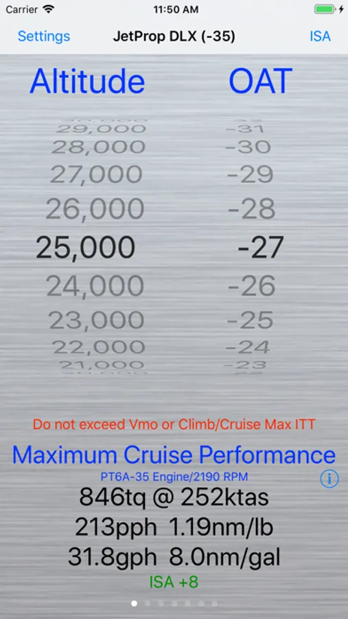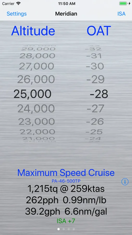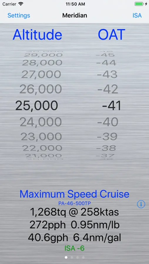 Utility for pilots of the Piper Meridian, M600, and JetProp DLX (-21 and -35) airplanes. Pilot enters altitude and outside air temperature; the app immediately calculates max speed cruise torque, true airspeed, pounds per hour, and NM/pound.
