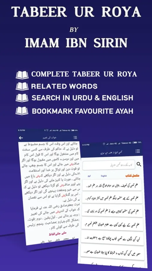 Tabeer ur Roya (interpretation of Dreams) is a collection of various books of dream interpretation including Danyal A.S., Imam Ibn Sereen and Imam Jafar Sadiq. In this app you can search for the explanation of your dreams through Urdu and English keywords. Moreover, Bookmarks help you save your search in your app and you can share your search with your friends on facebook, whatsapp and other social media networks.