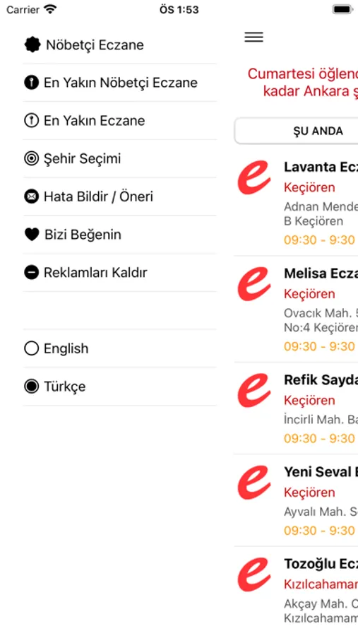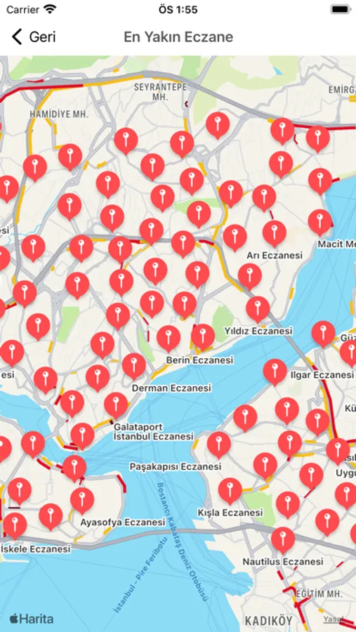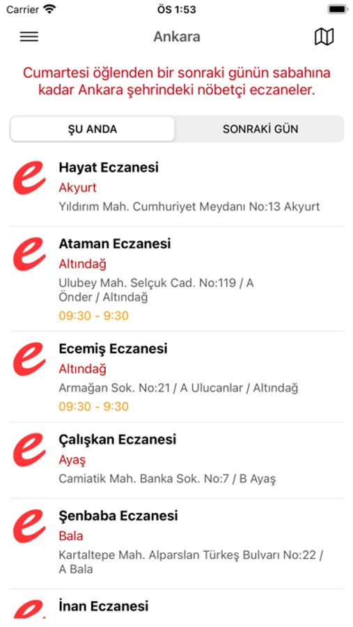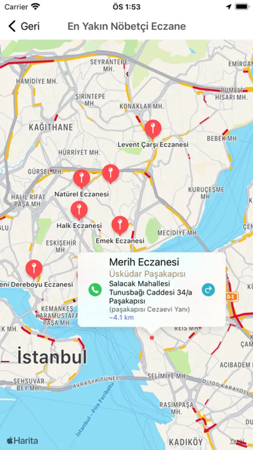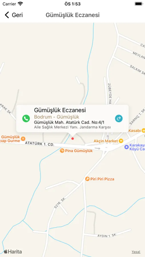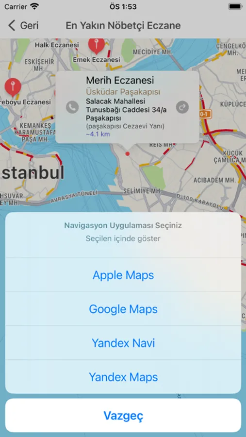 You can find all pharmacies with duty information in Turkey. You can search near by pharmacies easily and navigate to the location with google map or other map applications.