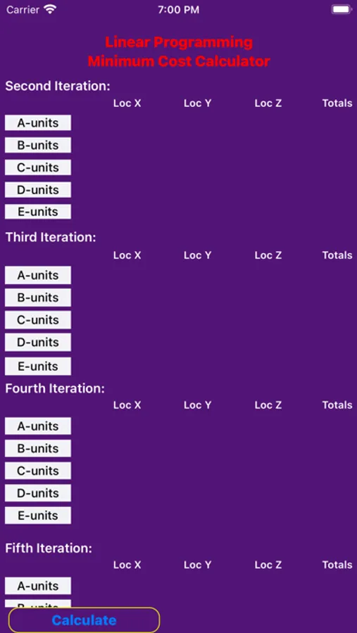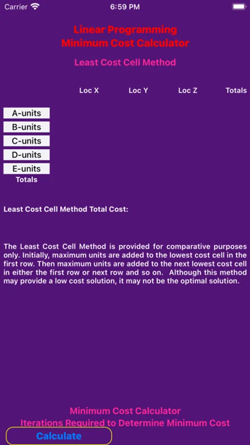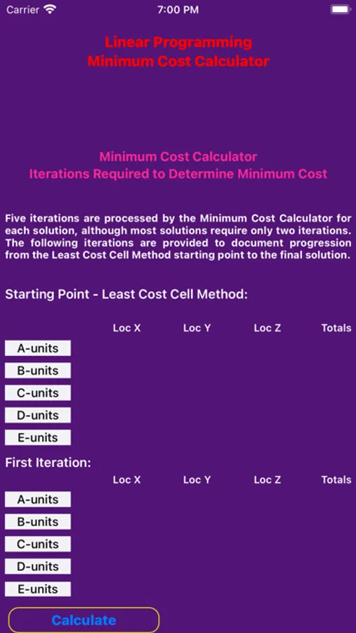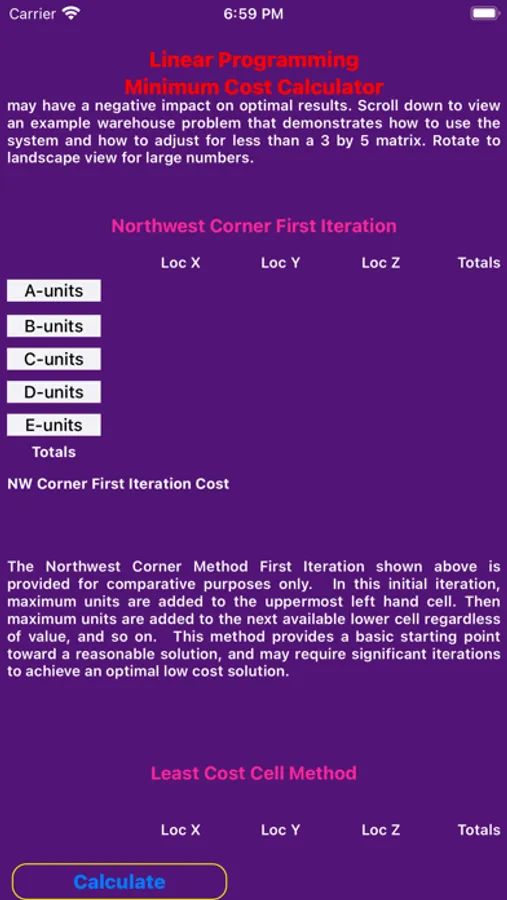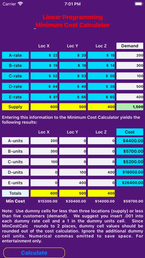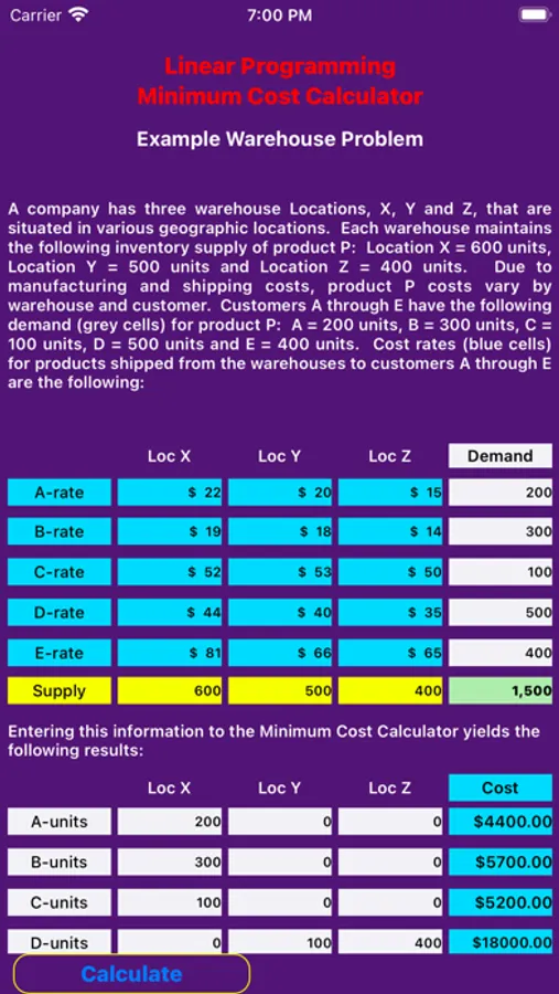 Using linear programming techniques, MinCostCalc calculates the minimum cost solution for shipping products located in three separate locations to five customers with different shipping rates for each location/customer combination. Shipping rates for customers are entered in the system along with customer demand and available product supply. In addition to quickly calculating the minimum cost and quantities matrix, MinCostCalc provides the first iteration of the North West Corner method along with the Least Cost Cell method for comparative purposes. Five detailed iterations are available to show the steps required to achieve the minimum cost solution. An example problem and solution are included to assist with understanding system operation.