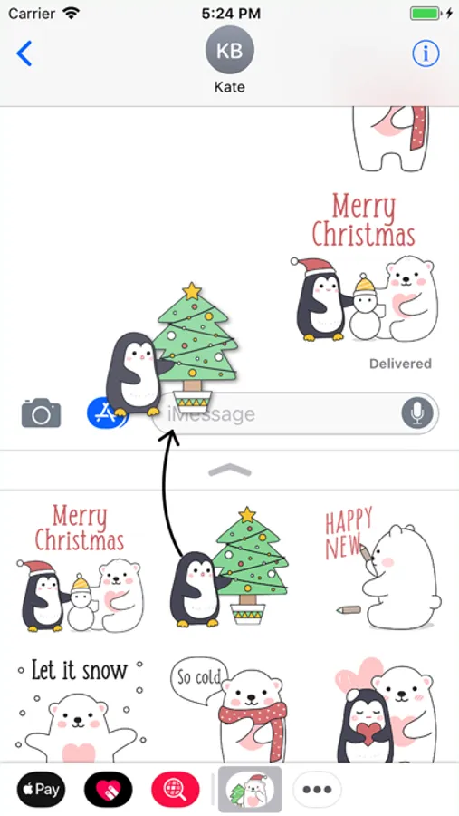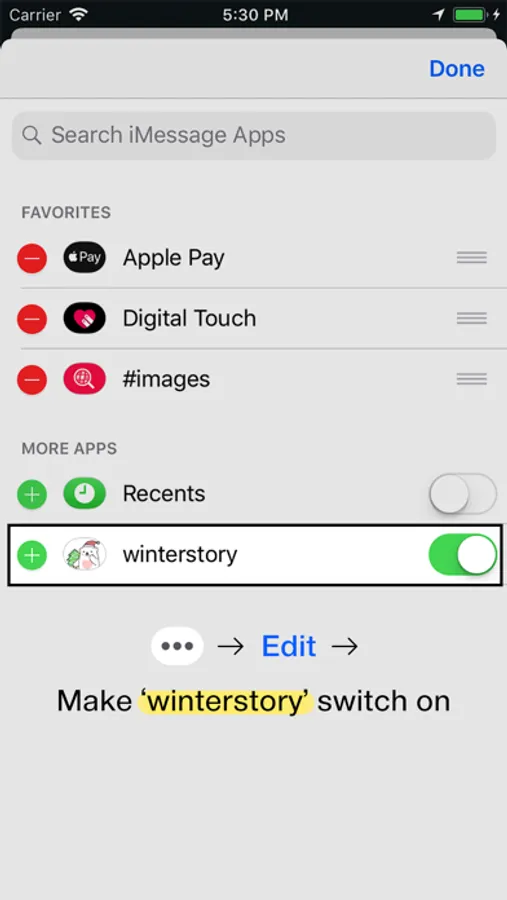 • Tap the more icon(...) to access the App Store for iMessage. Tap Edit tab and find 'Winterstory' stickers to add them.
