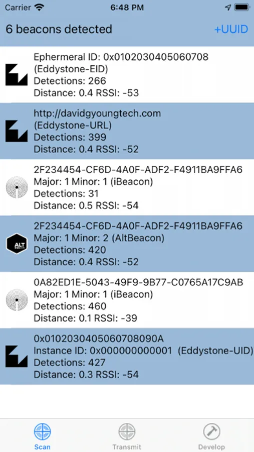 Bluetooth LE Beacon scanning and transmission utility. Supports iBeacon, Eddystone and AltBeacon formats. Measures signal level and packet count to measure beacon quality