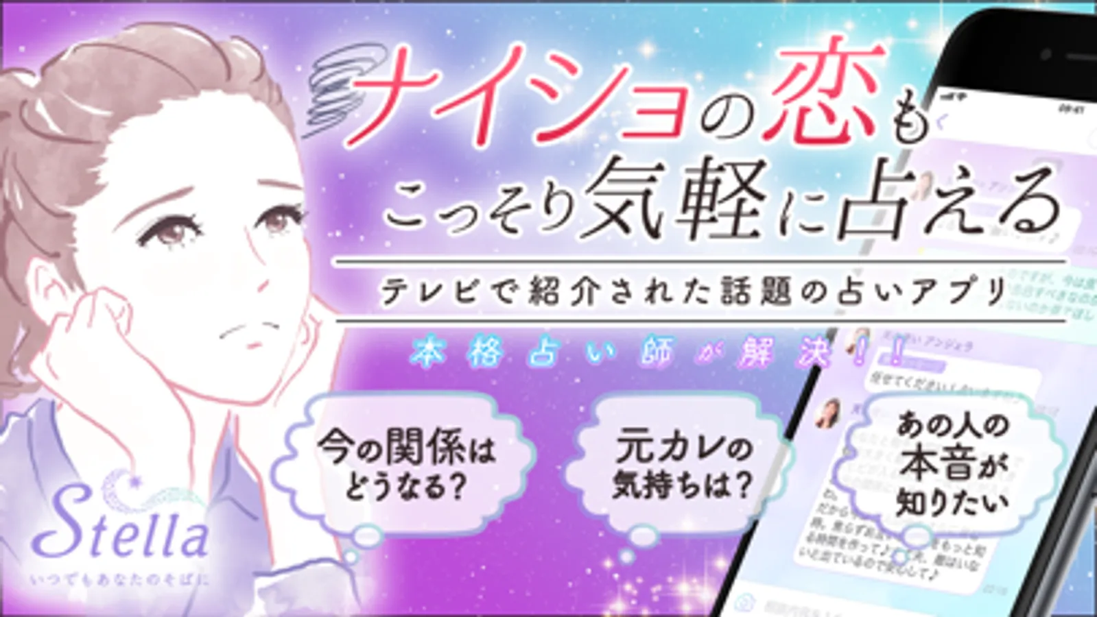 占いアプリStella(ステラ)では、メールアドレスや電話番号等の個人情報登録なしで占い師・カウンセラーにお悩みを相談できます。