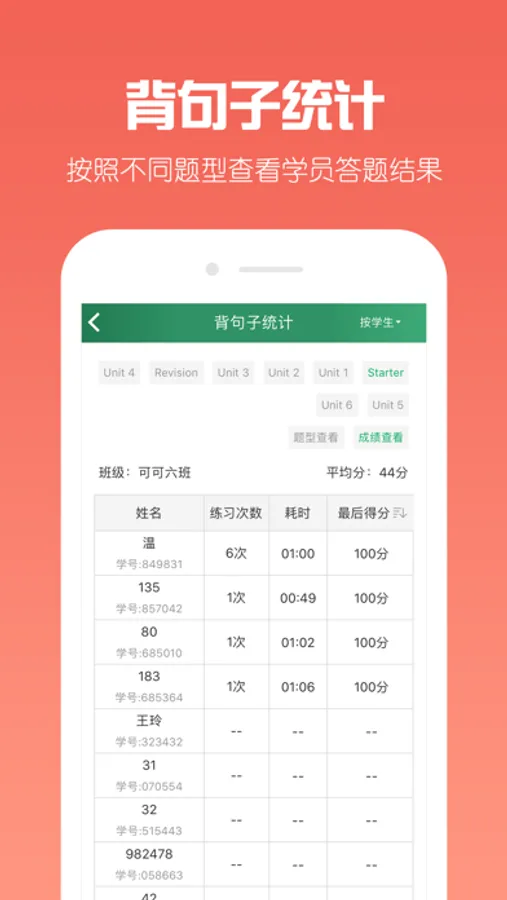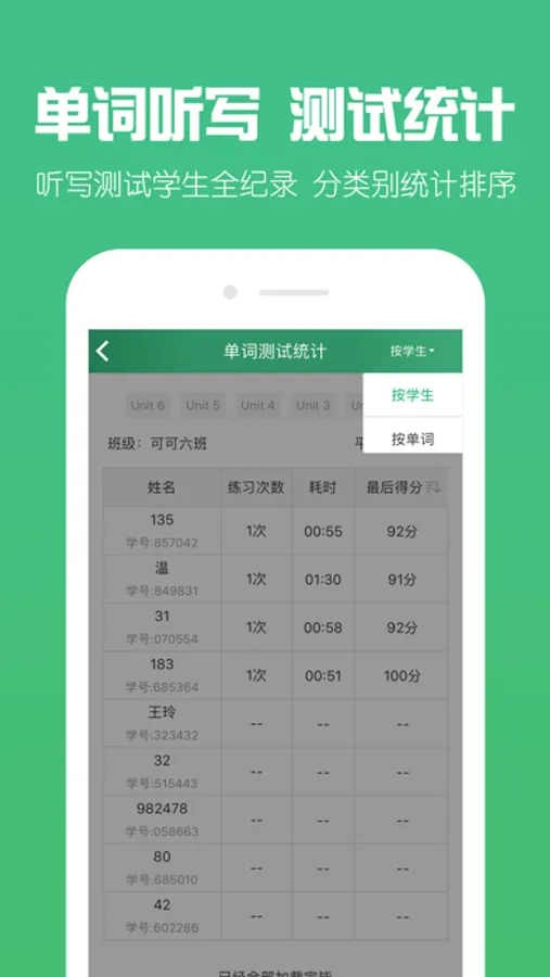 3、班级统计:支持单词听写、单词测试、背句子、课本点读训练统计。