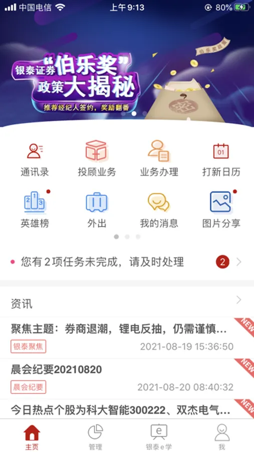 泰e达”是银泰证券精心打造的移动展业平台,旨在为不同角色的证券参与者提供高效、专业、便捷的移动展业服务。通过“泰e达”可获取由银泰证券提供的实时金融资讯,了解银泰相关产品和业务流程,提交证券业务活动的外出申请,跟进服务潜在客户群体。移动展业,运筹帷幄,尽在掌中!