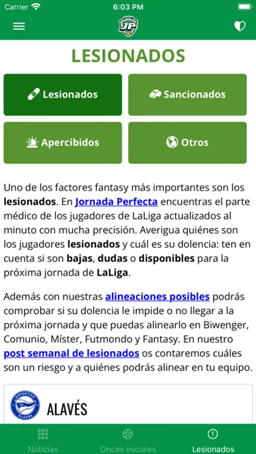 Jornada Perfecta es una app donde encuentras toda la información para ser el mejor manager fantasy en plataformas como Biwenger, Comunio y Futmondo. La app tiene una sección principal con la actualidad y noticias de LaLiga en clave fantasy: análisis de compra y venta, mejores jugadores, onces ideales, lesiones importantes, etc. Además, se complementa con secciones claves como la de Onces Posibles, Puntuaciones, Lesionados, Sancionados, Estadísticas y Cronistas.