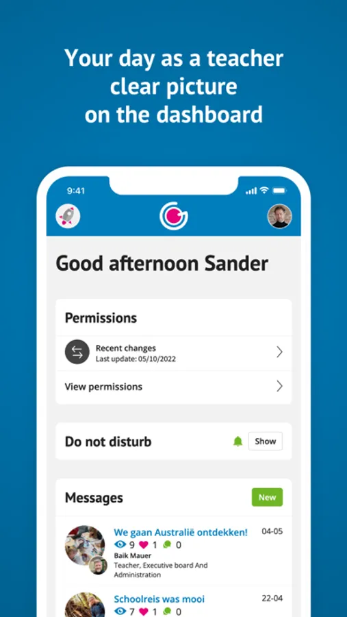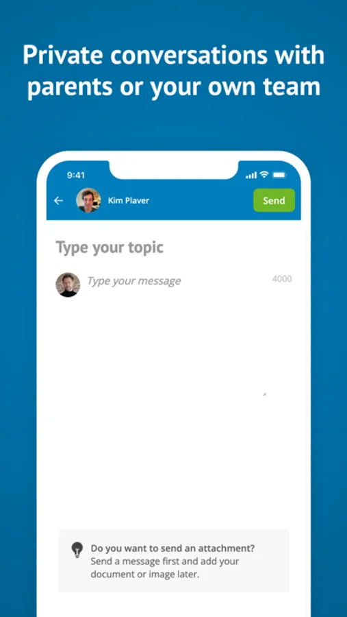 • Topics: Chat directly with parents. Send photos and files, safely and easily.