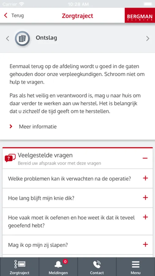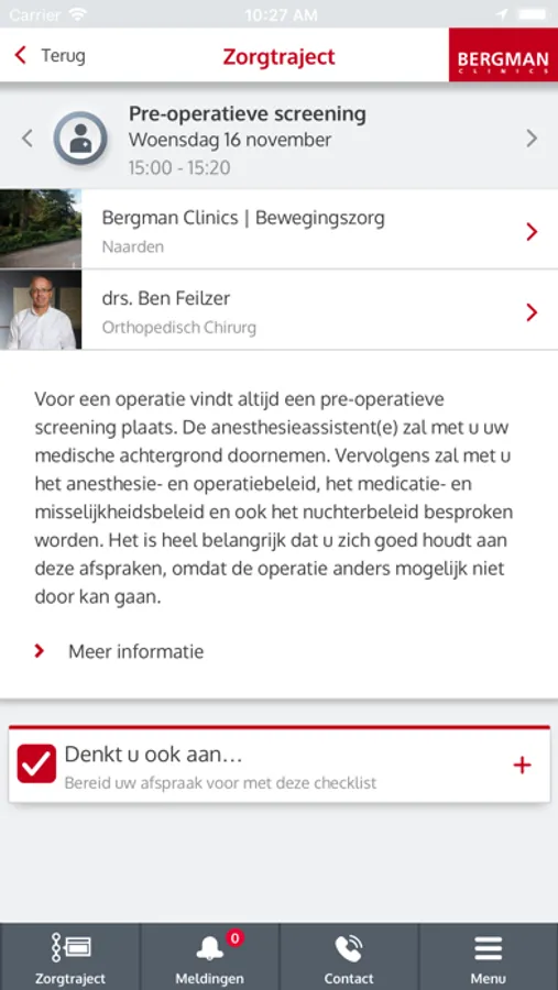 Mijn Bergman Clinics is een gratis applicatie voor telefoon, tablet en desktop en is altijd en overal beschikbaar. Mijn Bergman Clinics biedt u op een efficiënte wijze, alle informatie over uw behandeling en persoonlijke zorgtraject. Voor, tijdens en na de behandeling ontvangt u specifieke, relevante informatie in korte berichten en herinneringen in uw persoonlijke tijdlijn. Met de gebruikersvriendelijke app Mijn Bergman Clinics bent u optimaal voorbereid op de behandeling en uw herstel.