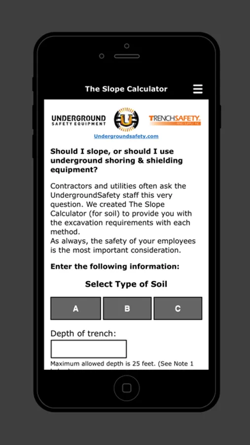 Underground Safety Equipment provides solutions that make construction work safer, more productive, and more profitable. This Slope Calculator is a handy, easy-to-use tool that compares the “pros and cons” of sloping an excavation versus using shoring and shielding equipment. Simply enter the Soil Type you will be are working in —Type A, B, or C — along with the dimensions of your excavation to see the calculated results, AND a drawing to guide you and your crews. You can even save the results and data as a PDF, and send them to anyone, anywhere via e-mail.