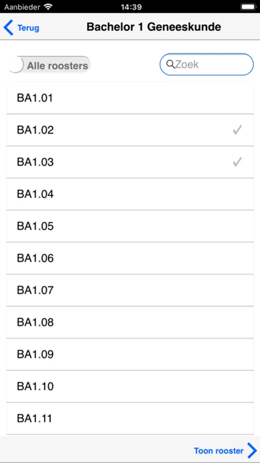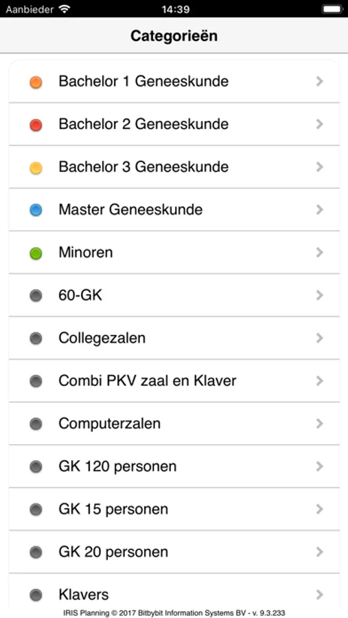 Categorie-item-scherm: per categorie verschijnt een lijst van bijbehorende items: groepen, cursussen, lokalen, docenten. Je kunt meerdere items selecteren. Via een zoekfunctie kun je items zoeken.