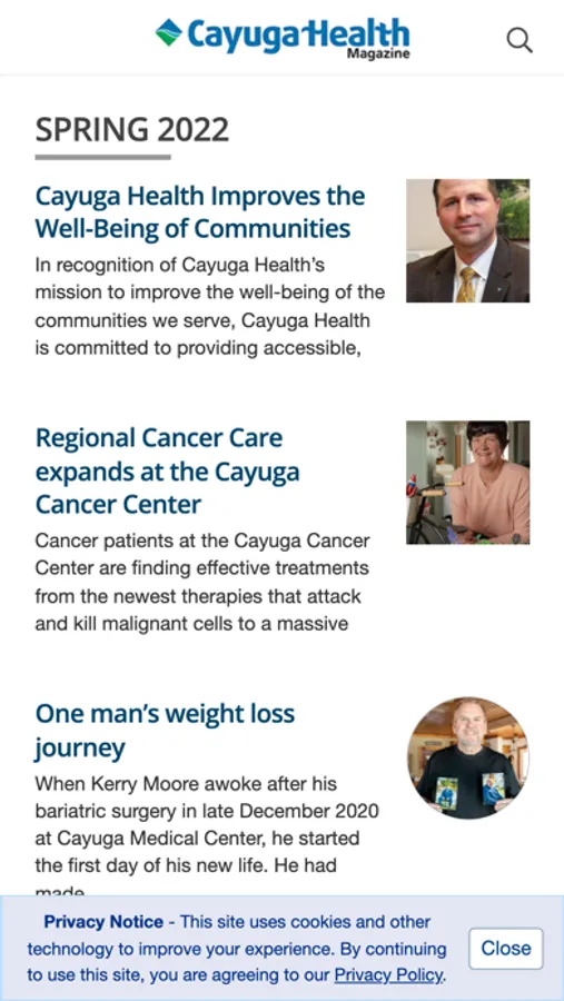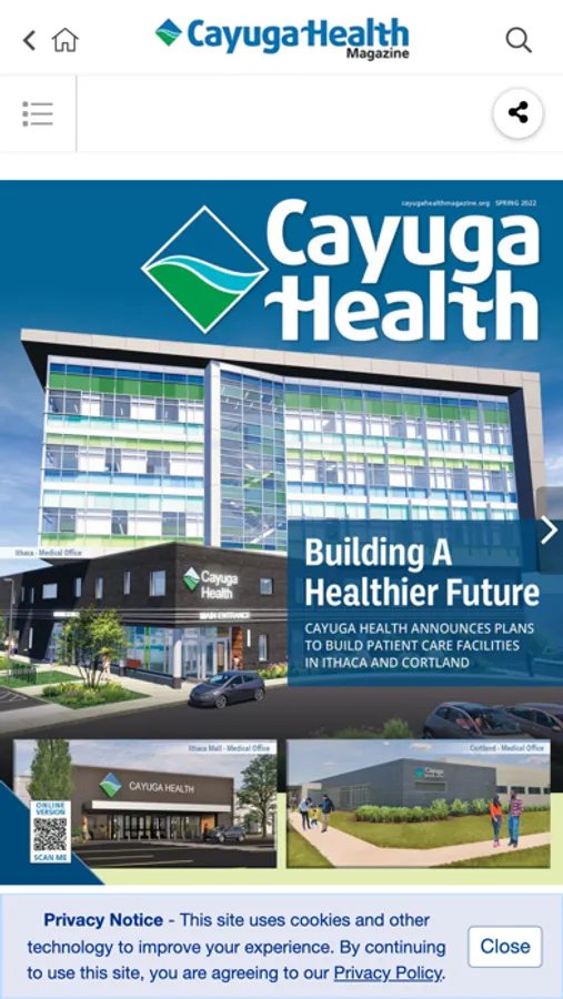 Cayuga Health Magazine, a bi-annual publication for Cayuga Medical Center and Schuyler Hospital, provides our region with the latest information and advancements for the health system. The magazine gives us the opportunity to demonstrate our commitment to comprehensive local care, expanding services, and improving our community. Health and wellness are the core elements of a strong community. The Cayuga Health System is committed to leading the way in supporting the well-being, vitality, creativity, and productivity of the people we care most about: you.