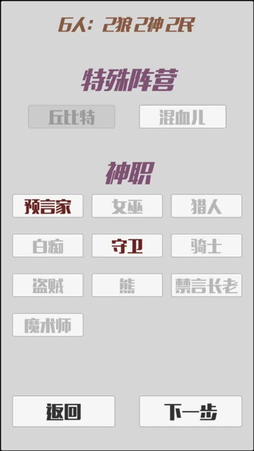 当前支持身份:狼王、白狼王、狼美人、恶魔、混血儿、预言家、女巫、猎人、白痴、守卫、骑士、盗贼、熊、禁言长老、魔术师。