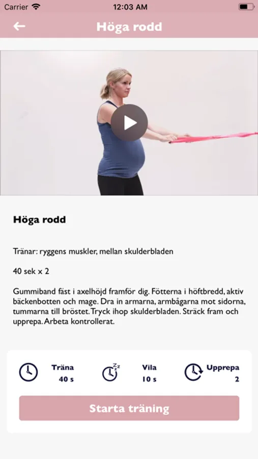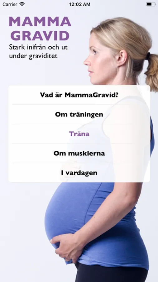 Fortsätt motionera efter din egen förmåga. Parallellt gör du övningarna i appen som stärker viktiga muskler som jobbar hårdare under graviditeten och som även töjs ut.