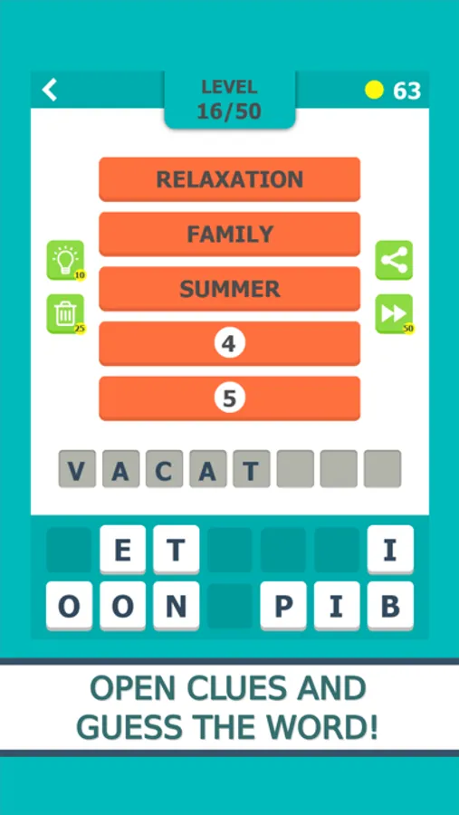 There are two game play modes in the game. In the first, for each level you will have 5 associations in the form of words, while in the other, the tips are given in the form of pictures. Your goal is to find a solution that combines all these words or images. The fewer clues you use, the greater is the final reward. If you get stuck at one of the levels, you can use one of the three types of help.