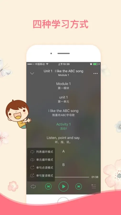 2.具有自动顺序播放,单元循环播放,句子点读,句子点读复读功能。