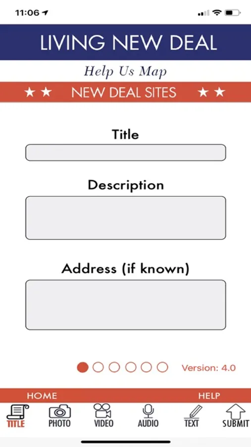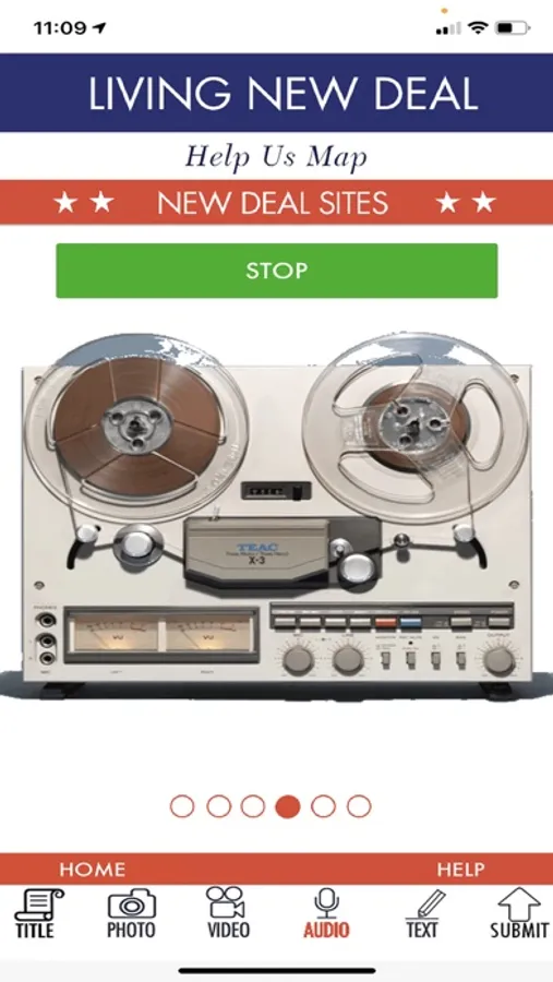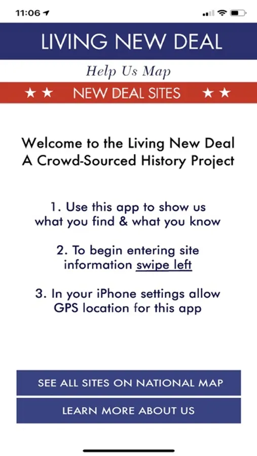 The Living New Deal is a public information and education project whose goal is to document and map all New Deal public works across the United States. This app allows the user to be an active participant in this project by providing a means for the user to capture pictures, videos, audio recordings and written messages, all tagged with GPS coordinates, and upload those media to be included in the main database.